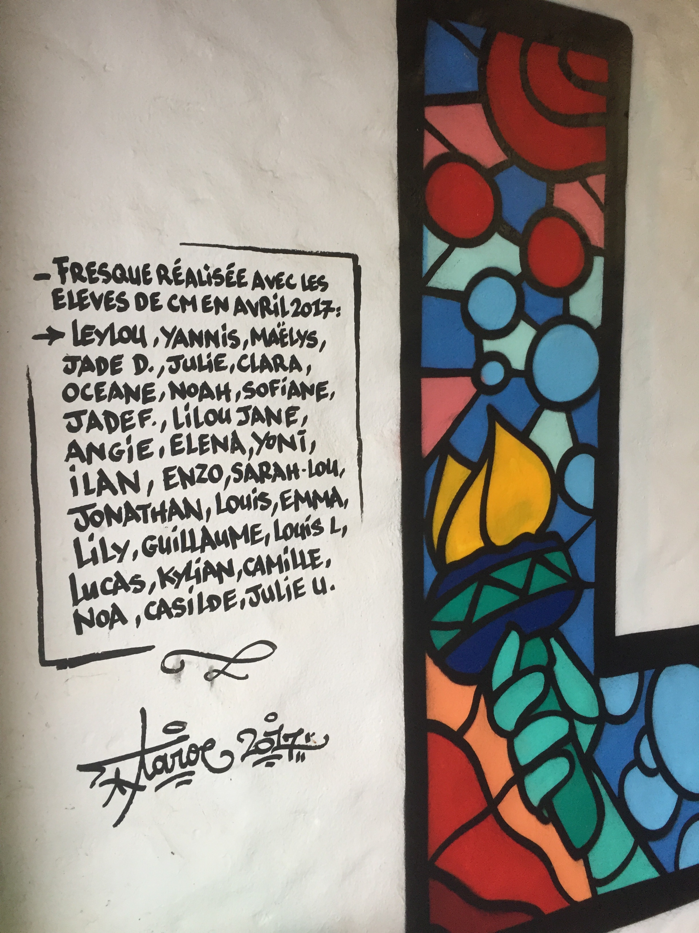 Grace à l'Association Bidache Culture, voici la fresque réalisée avec les élèves de CM à l'école publique de Bidache, lors des ateliers dirigés par Taroe et le concours de Spacejunk Art Centers.